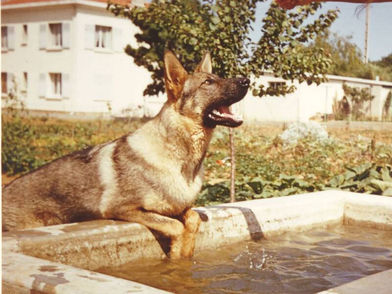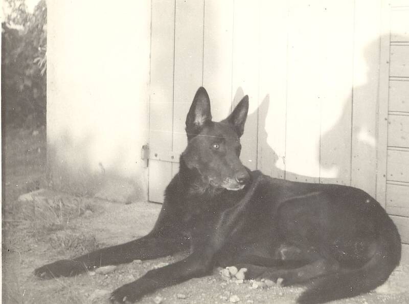 Black : Une boule de poils noirs cachée sous la veste de mon père, c'est ainsi que Black se présenta en 1962. C'était un croisement de berger belge groenendael et probablement malinois ou Tervueren, tout noir avec un losange blanc sur la poitrine. Très intelligent et bon gardien. Vous pouviez entrer dans la propriété, mais il ne vous en laissait pas ressortir si nous n'étions pas là. Nous avons cheminé ensemble durant 9 ans.