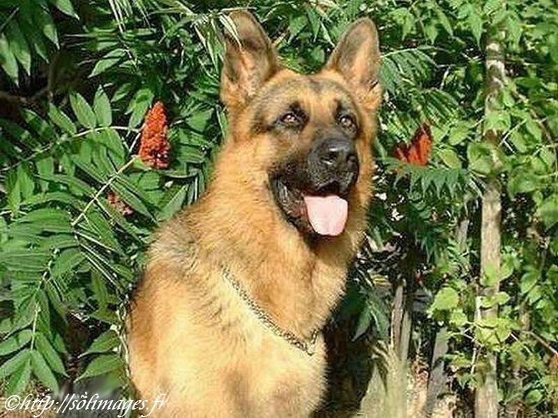 Sphinx, de son nom complet Sphinx de la Résidence des grands Chênes, berger allemand né le 27 janvier 2001, a débarqué chez nous le 28 juin 2002. Calme et un peu désorienté, son premier souci a été de courser Domino, le chat de la maison, avec moi à l'autre bout de la laisse..........Résultat : un bras cassé ! Malgré tout, je ne l'aime pas moins pour ça. Le temps passe, les relations chien-chat s'améliorent, mais il y a eu du travail. Puis Domino nous a quitté en ce mois d'août 2007. Monsieur Sphinx n'aime pas rester tout seul dans la maison, nous en avons fait l'expérience un jour, peu de temps après son arrivée, la pluie tombant fortement, nous l'avons laissé à l'intérieur. La télécommande de notre télé n'a pas résisté à ses crocs, mais malgré son piteux état, elle fonctionne toujours. La seconde fois, il pleuvait encore, nous avons pensé qu'enfermé dans le garage, ça ne risquait rien. Là, c'est la chatière, toute neuve posée la semaine précédente, qui est partie en mille morceaux, hachée menu !